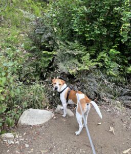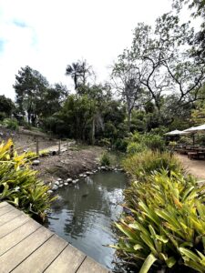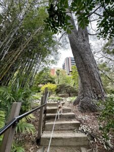 As we wrapped up our coffee shop visit, Toby and I strolled our way to the beautiful UCLA campus, heading north on Westwood Blvd. The campus was a sight to behold, so we decided to venture through it and take a right turn onto Charles E Young Dr. It wasn’t long before we stumbled upon the UCLA Mildred E. Mathias Botanical Garden. The garden was beautiful, with a babbling creek and benches scattered throughout. Toby couldn’t contain his excitement, sniffing all the new smells and even spotting a duck by the water. The dirt trail was nicely paved, providing a cool and shady path to explore. It didn’t take us too long to wander through the entire garden, and we took a well-deserved break on one of the chairs.
