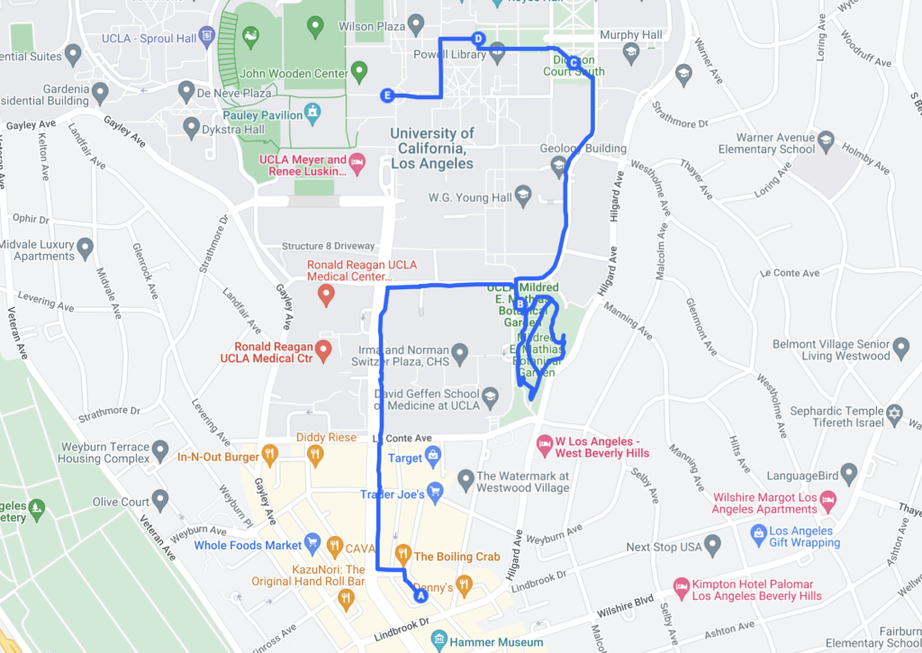 View our interactive map on Google Maps. Select the “UCLA Botanical Garden & Bruin Statue” layer for a detailed map of our walking route!