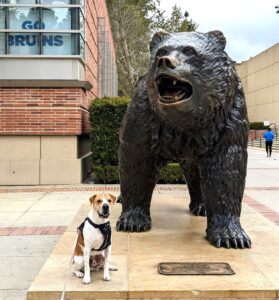 After a quick recharge, we continued our adventure around the UCLA campus. We left the garden behind and followed Charles E Young Dr as it curved north. We found ourselves in Dickson Court, a spacious area with plenty of grass for Toby to sniff around. We passed by the Shapiro Fountain, then headed south. Eventually, we landed in the Bruin Plaza, where the famous UCLA Bruin Statue stood tall. We couldn’t resist capturing a photo with the Bruin before deciding to wrap up our exploration.