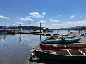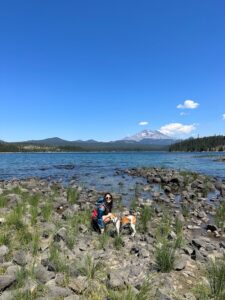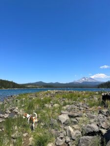 We first explored the South Beach Picnic Area a little bit. There is a small parking lot, and given that it was such a beautiful day in the summer, the little parking lot was pretty full. We found a spot luckily and walked along the south border of Elk Lake. There were many people having picnics, kayaking, and paddleboarding. There isn’t a place to rent water activity equipment here, though, so you’d have to bring your own equipment. Also, this is part of the Deschutes National Forest, so there is an honor system for paying the parking fee at the parking lot. If you have a national parks annual pass, you could simply display that on the dashboard of your car.