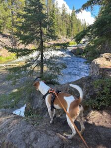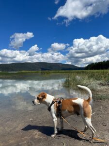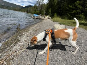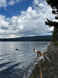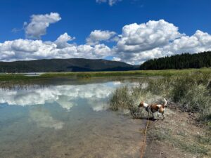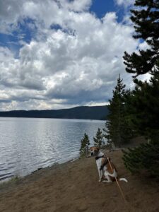 Afterward, we headed east towards Paulina Lake to walk along the Paulina Lakeshore Trail. There is a nicely-shaded dirt path that takes you As we strolled along the lake, we also explored the Paulina Lake campground, where many people with RVs and camper vans were enjoying the area. Reserving a spot and obtaining a permit is necessary if you plan to spend the night at the campground. The water was clear, and the lake was stunningly beautiful. It was a delightful day out. Although there are likely other trails on the opposite side of Paulina Lake, we decided to return and drive up to Paulina Peak.